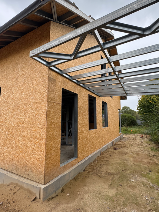 - Bauweise: Stahlrahmenwände; Außen 31cm Wandaufbau